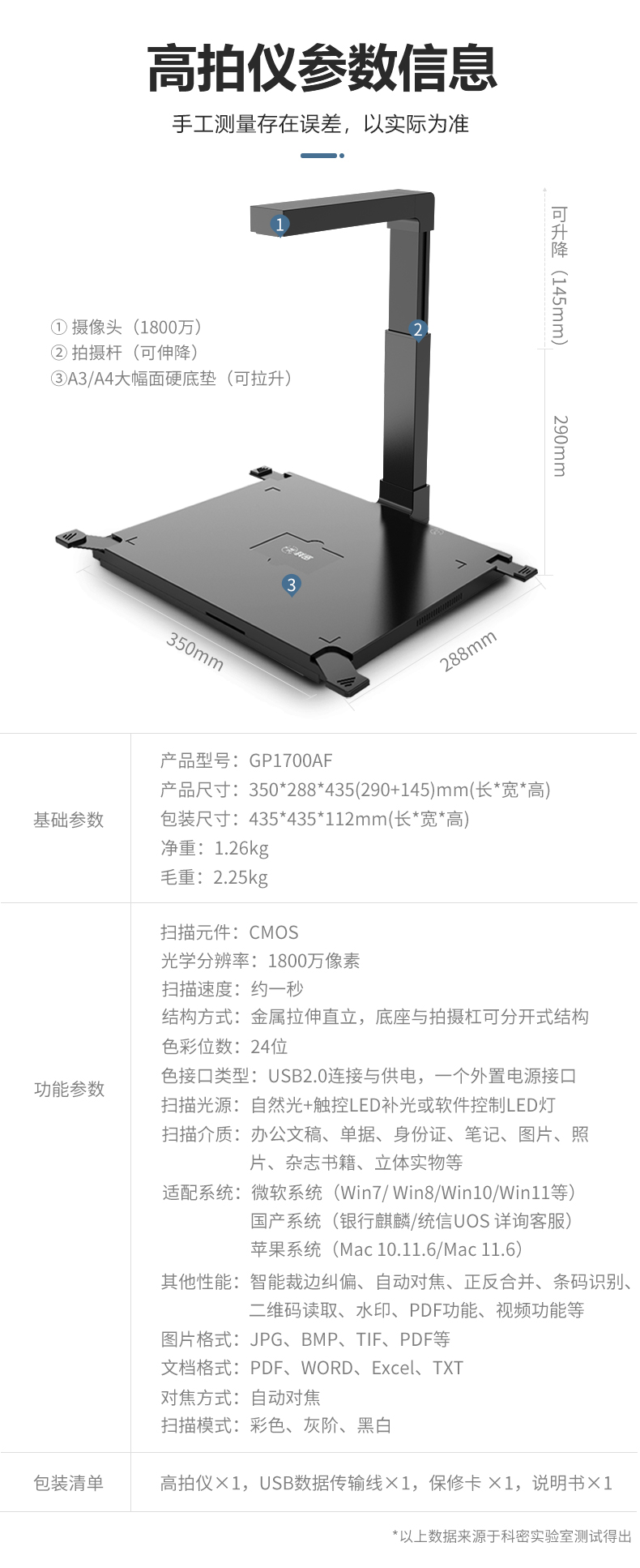 科密(comet) GP1700AF 高拍儀 1800萬像素 可在線升級A3A4掃描儀 文件PDF合成 OCR識別 支持國產(chǎn)系統(tǒng)